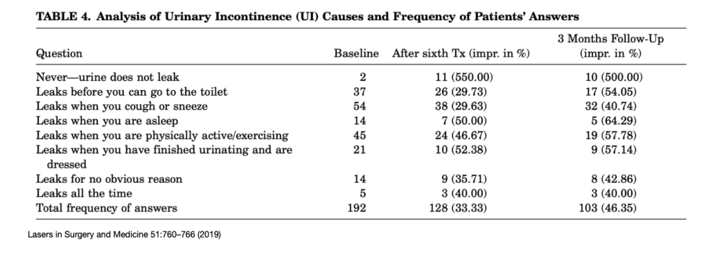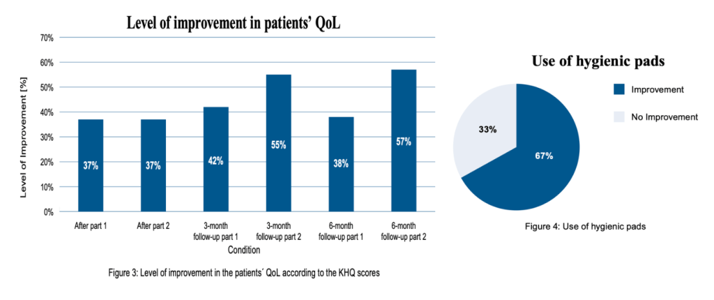 En un estudio por Berenholz J, en el 2022, se investigó la eficacia en términos de percepción de salud, impacto de la incontinencia (cuestionario KHQ y QoL)